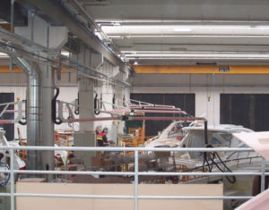 En la imagen, sistema de aspiración de polvo de lijado de fibra de vidrio centralizado mediante brazos articulados.
