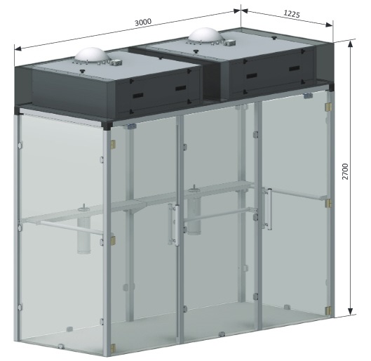 En la imagen, cabina doble para aspiración de humos de tabaco en hall de gran empresa. Su propietario quería evitar la imagen de fumadores en el exterior de las instalaciones y decidió montar una cabina para crear un espacio corporativo a la vez que evitaba la exposición al frío y al viento de sus trabajadores.